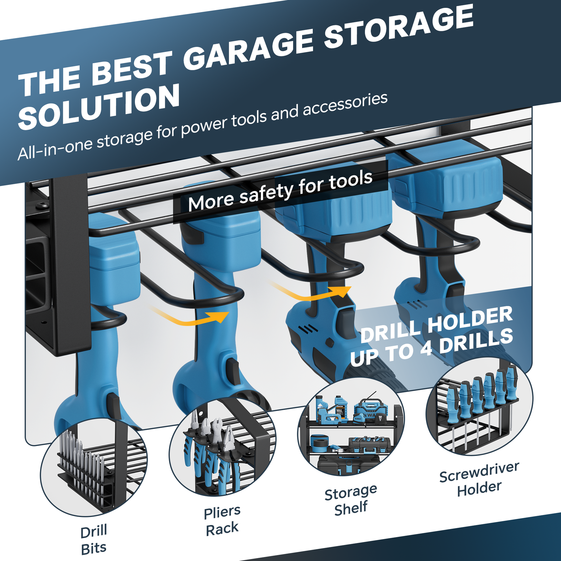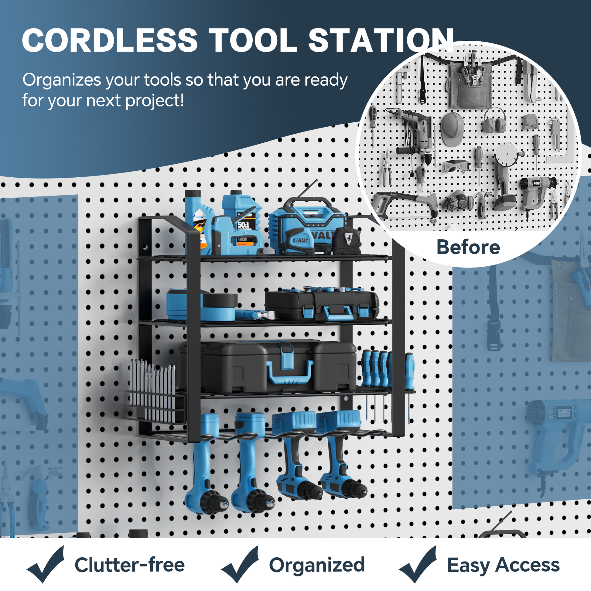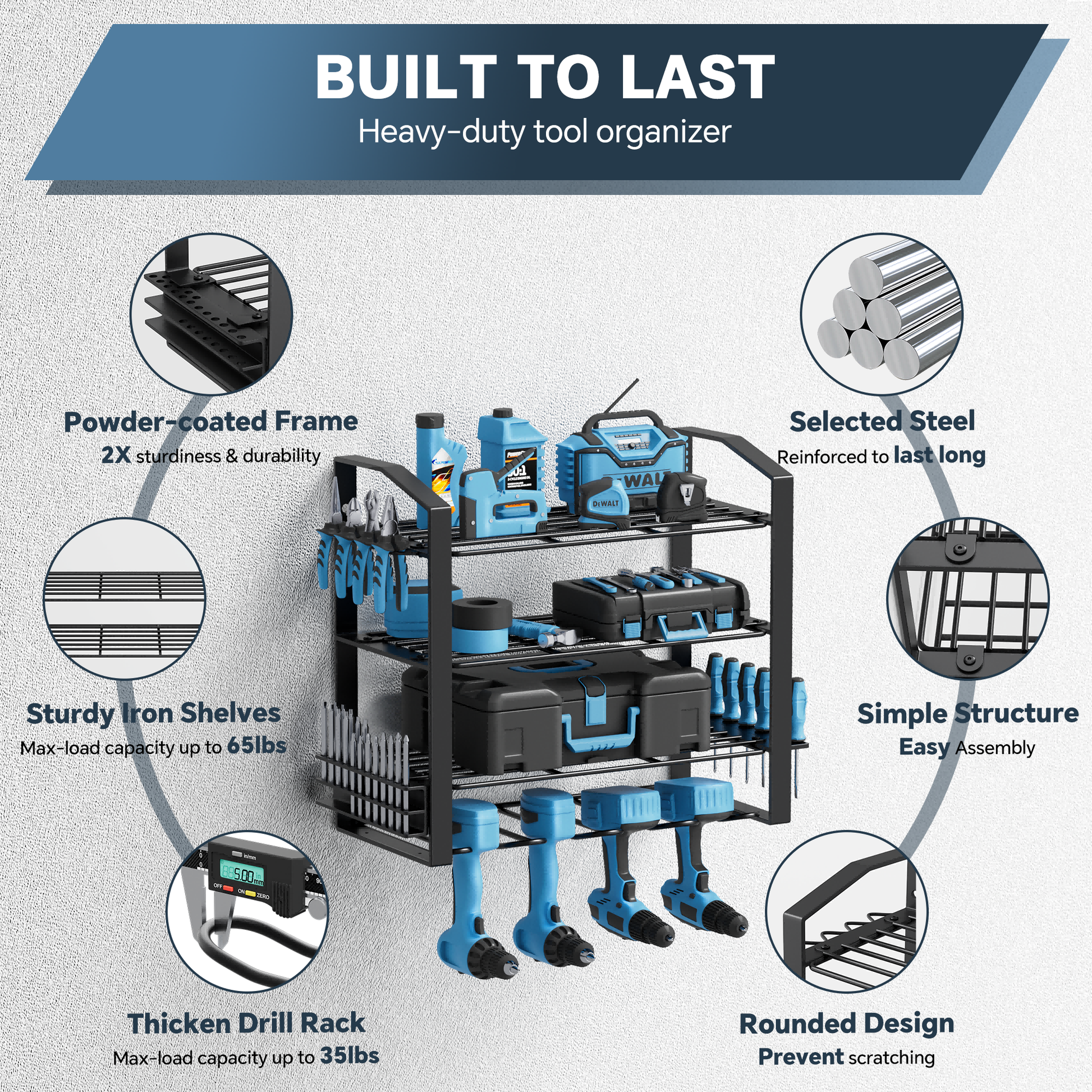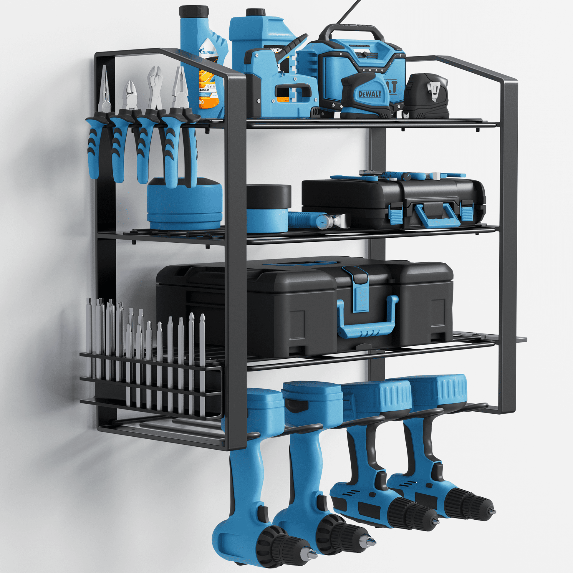 - Sturdy frame can hold up to 50 pounds of weight, making it ideal for storing heavy power tools such as drills, saws, and impact wrenches.