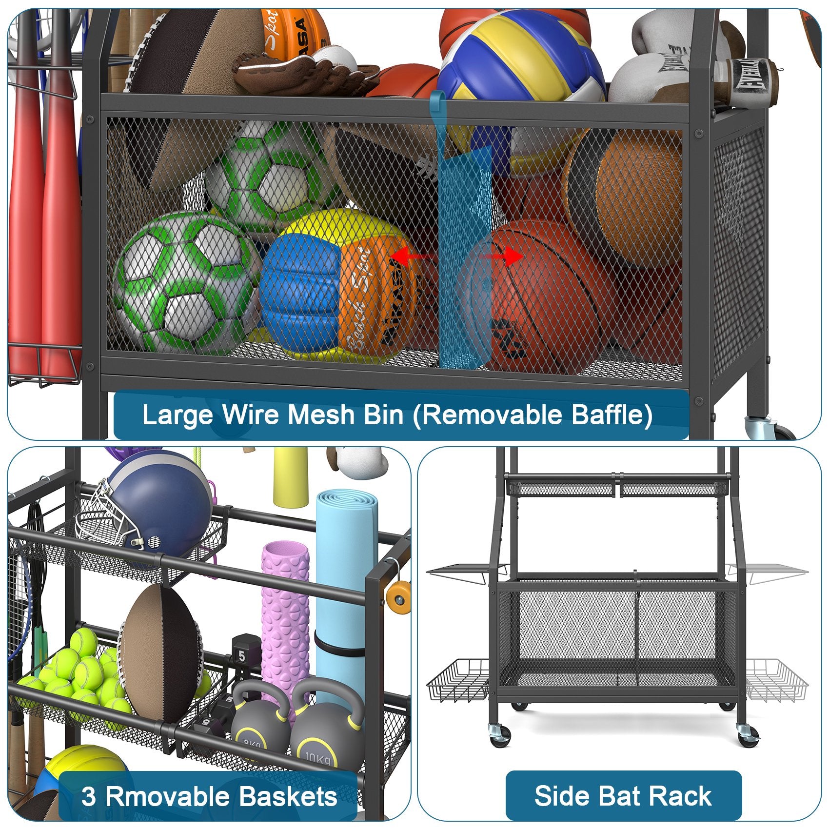 Sports Equipment Organizer Rack, Rolling Ball Storage Cart with Hooks, for Garage and Home